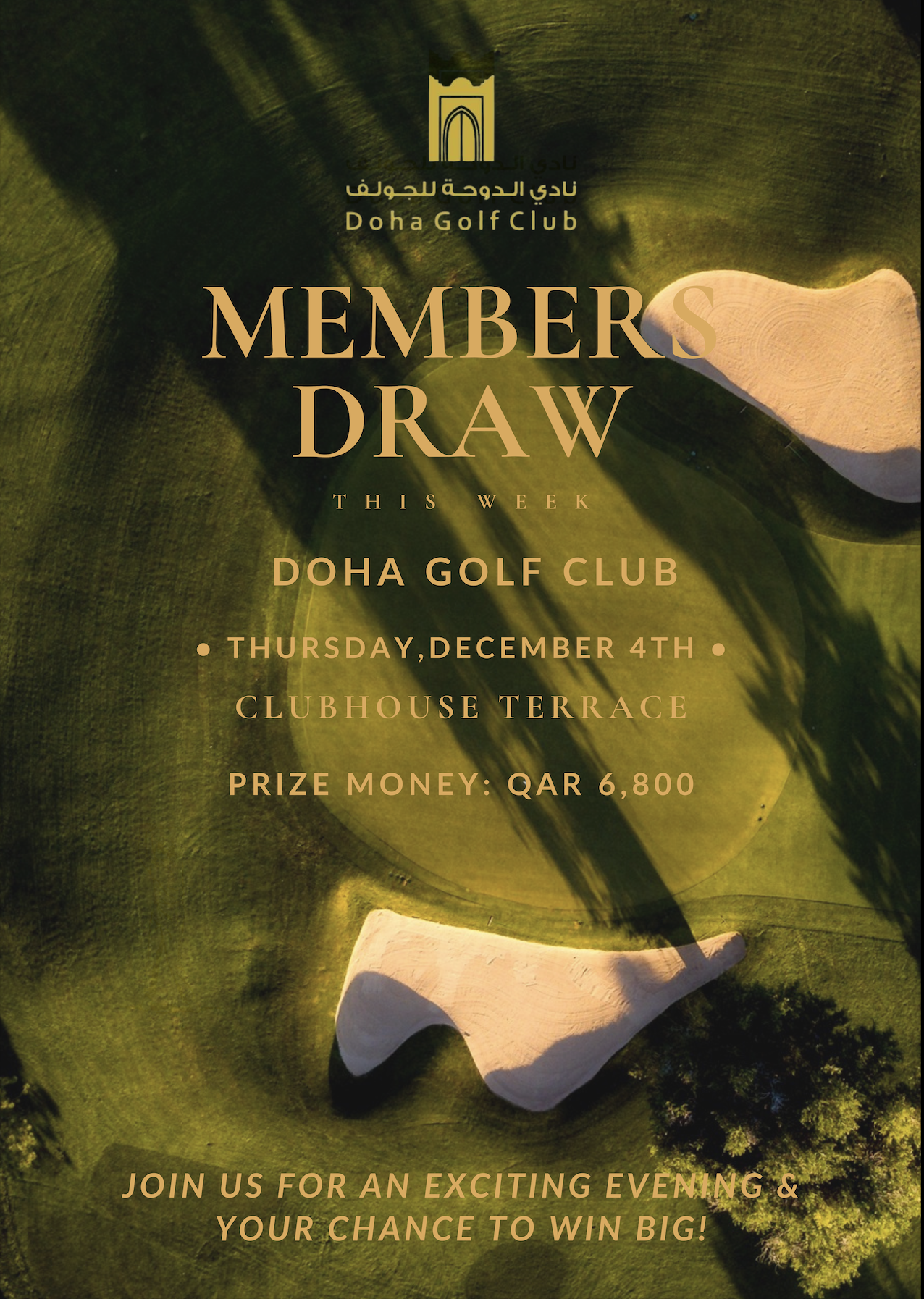 Join us on the Club House Terrace today at 6:30 PM for the Members Draw! Don’t miss your chance to take home this week’s QAR. 6,800 prize. See you there! The member must be present in order to claim the prize, within 60 seconds of the announcement.